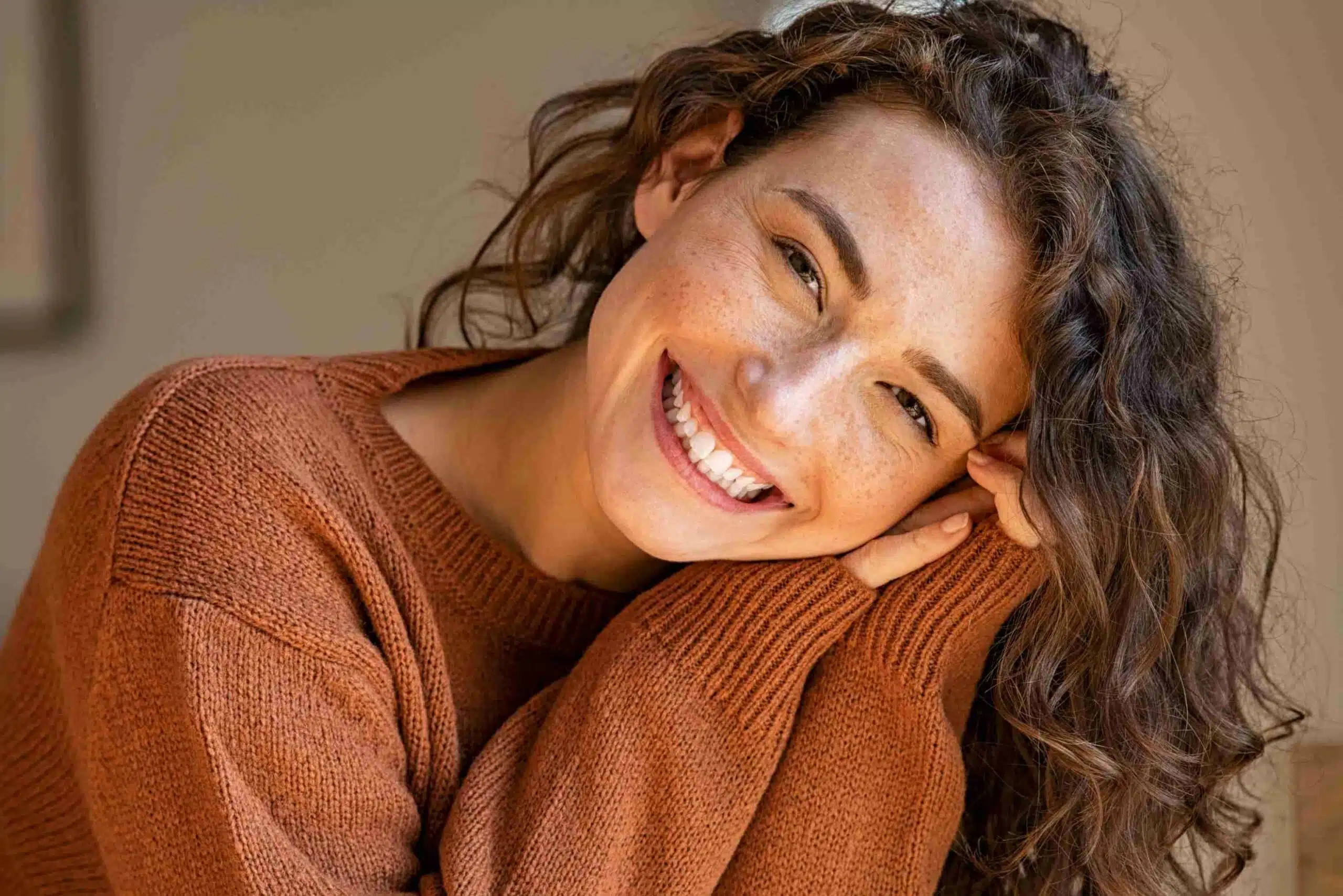 Jolie femme rousse qui sourit Idee recue N 1 Les injections d acide hyaluronique ou de botox figent le visage | Dr Aime Antibes. Cannes, Nice